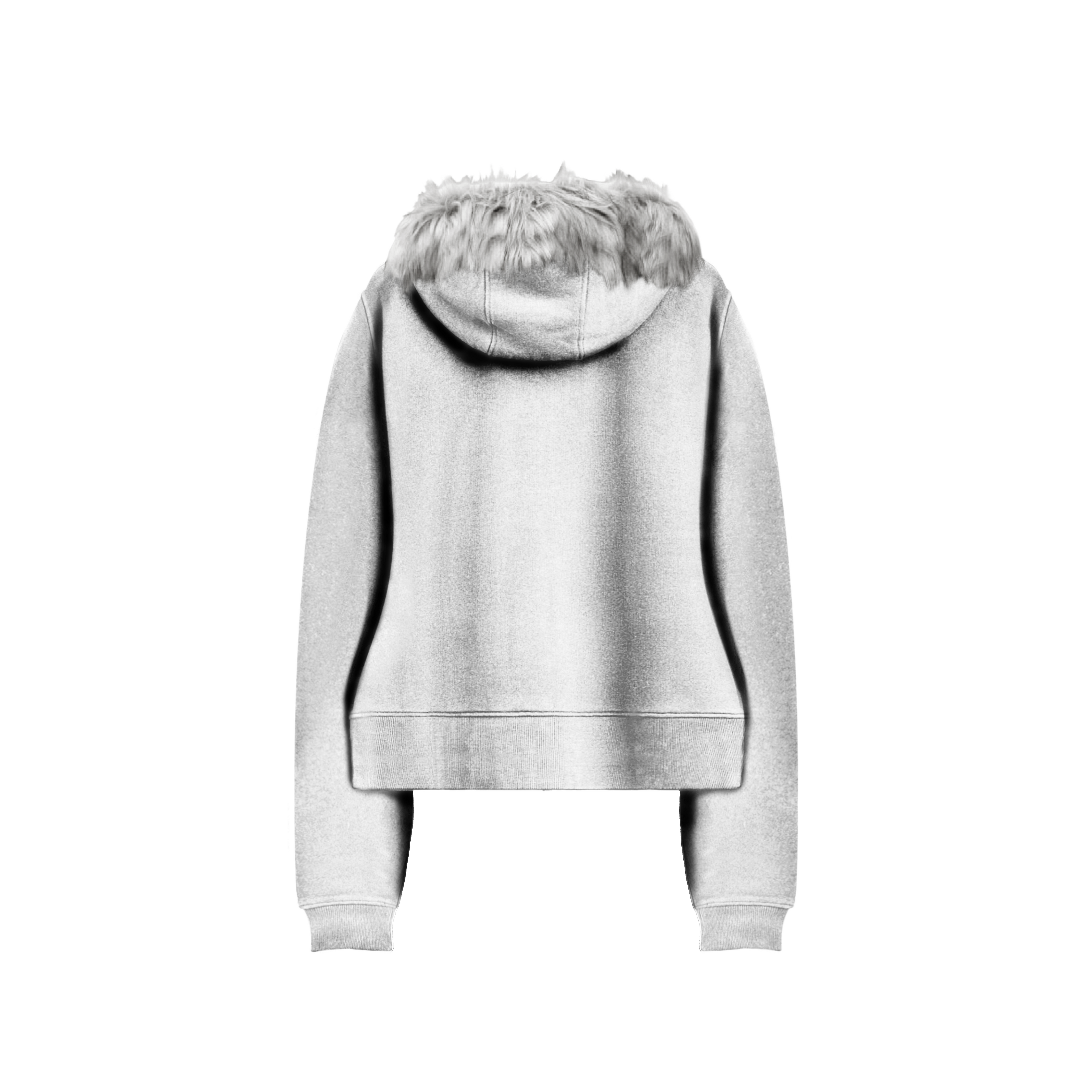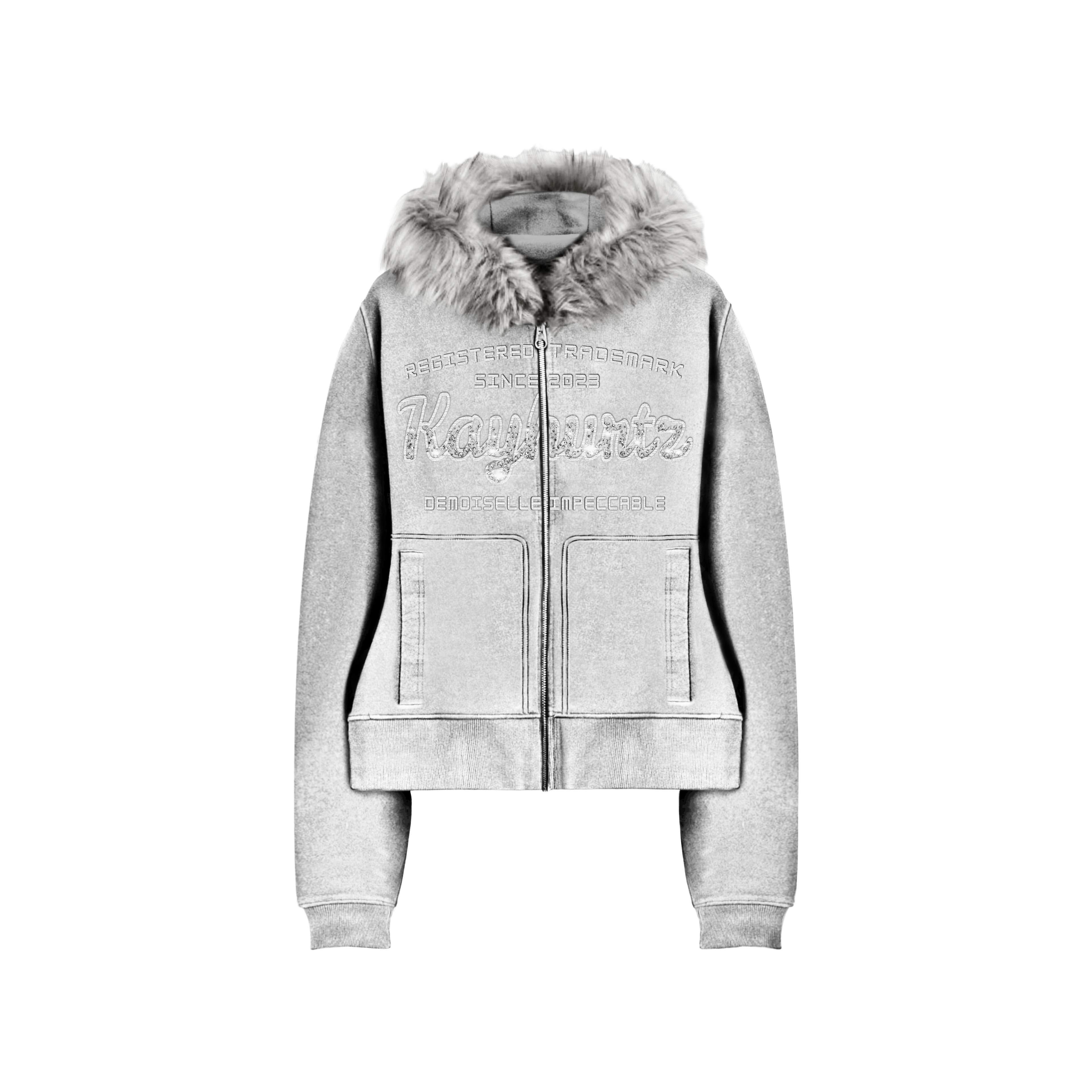 This women's zip-up hoodie is made with high-quality 470 GSM French Terry cotton for a cozy and durable feel. It features a faux fur-lined hood, front pockets, and stylish embroidered details for a standout look.
